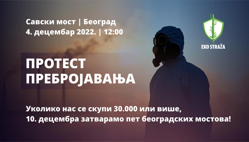 Неформална група грађана Еко стража саопштава да се трогодишња борба за безопасан ваздух наставља организовањем "Протеста пребројавања" који је заказан у Београду поред Старог савског моста за недељу 4. децембар у "пет до дванаест".