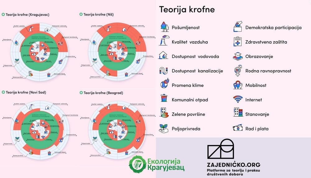 У циљу промене парадигме и увођења нових начина мерења одрживости тим истраживача из Платформе Заједничко израдио је моделе крофна економије за Београд, Нови Сад, Ниш и Крагујевац. Резултати указују да четири највећа града у Србији у многим индикаторима животне средине излазе ван оквира прихватљивих граница, док истовремено не задовољавају све социјалне и економске потребе својих становника. Пратећи резултате модела можемо видети на које аспекте развоја града је потребно усмерити пажњу доносиоца одлука.