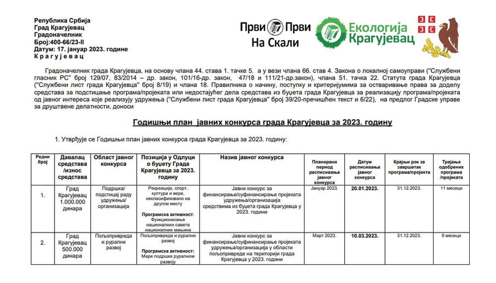ПРИЛОГ: ГОДИШЊИ ПЛАН ЈАВНИХ КОНКУРСА ГРАДА КРАГУЈЕВЦА ЗА 2023. ГОДИНУ