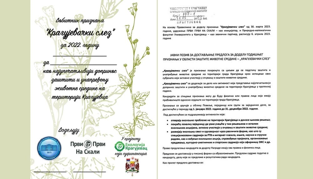 ЈАВНИ ПОЗИВ ЗА ДОСТАВЉАЊЕ ПРЕДЛОГА ЗА ДОДЕЛУ ГОДИШЊЕГ ПРИЗНАЊА У ОБЛАСТИ ЗАШТИТЕ ЖИВОТНЕ СРЕДИНЕ "КРАГУЈЕВАЧКИ СЛЕЗ"
