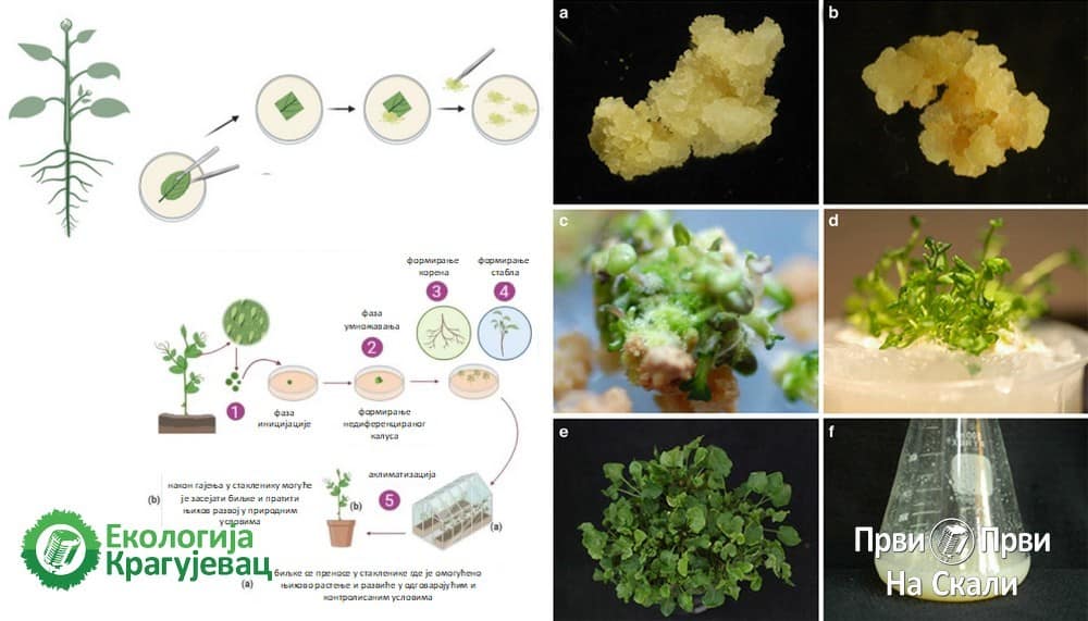 In vitro култура ткива генерисана из листова Арабидопсис халлери (а) и Арабидопсис тхалиана (б). Када се произведе трошни калус, асептички се преноси у медијум за регенерацију изданака (ц), а затим у медијум за регенерацију корена (д). Потпуно регенерисане биљке се гаје у стакленику (е). Добијени калус се може користити за генерисање стабилних култура ћелијске суспензије (ф)