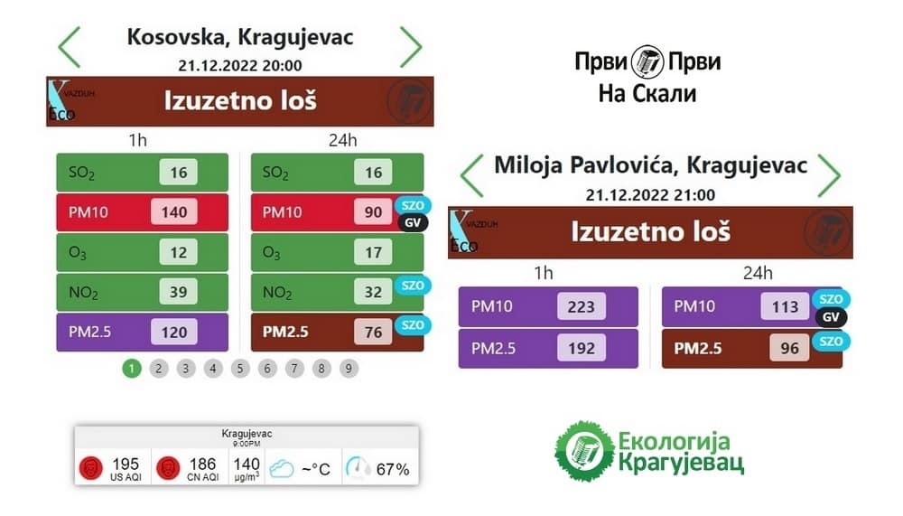 Квалитет ваздуха у Крагујевцу је изузетно лош, показују мерења државне станице на локацији у Косовској улици, забележена у среду 21. децембра у 21 час. Преко граничних дневних вредности евидентиране су суспендоване честице ПМ10 - 92, и ПМ2,5 - 77, док су сатне биле за ПМ10 137, а за ПМ2,5 120.