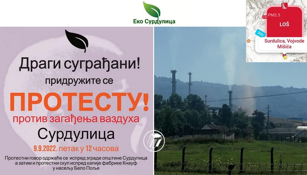 Протест против загађења ваздуха биће организован у Сурдулици испред зграде општине у петак 9. септембар од 12 часова. Након јавног скупа, следи протестна шетња која ће се завршити испред капије фабрике Кнауф у насељу Бело Поље.