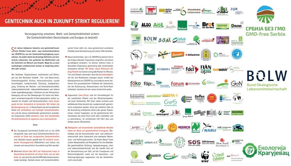 Применити принцип предостржности. Осигурати слободу избора и производњу без ГМО. Производња без ГМО у Немачкој и у Европи је угрожена!